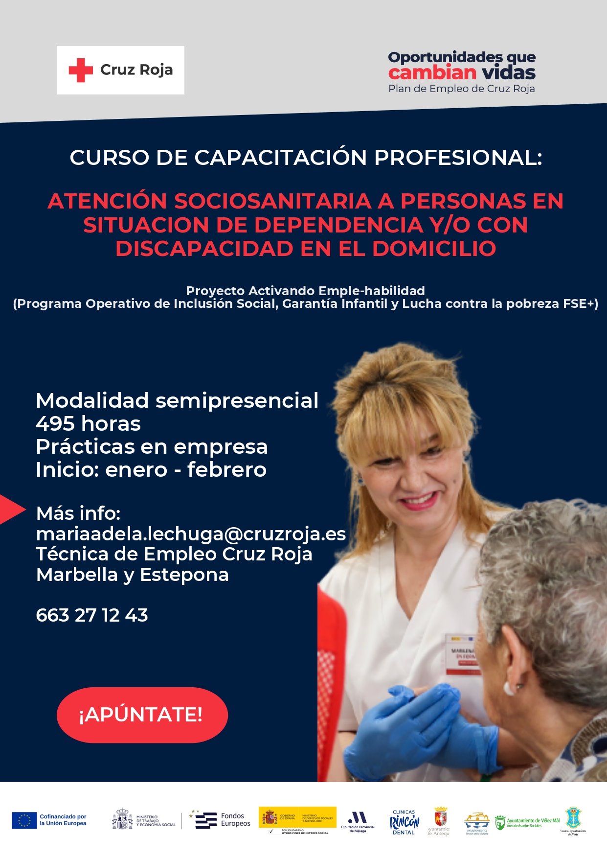 Desde la Delegación de Empleo Informamos de la próxima capacitación de Cruz Roja,  ATENCIÓN SOCIOSANITARIA A PERSONAS EN SITUACIÓN DE DEPENDENCIA Y/O CON DISCAPACIDAD EN EL DOMICILIO , que tienen prevista impartir desde el Programa Itinerarios Integrales de Acceso al Empleo Activando Emple-Habilidad, dentro de la operación 528764_1 ACTIVANDO EMPLE HABILIDAD con la financiación del Fondo Social Europeo Plus (FSE+) con cargo al Programa Estatal de Inclusión Social, Garantía Infantil y Lucha Contra La Pobreza (CCI: 2021ES05SFPR003).
