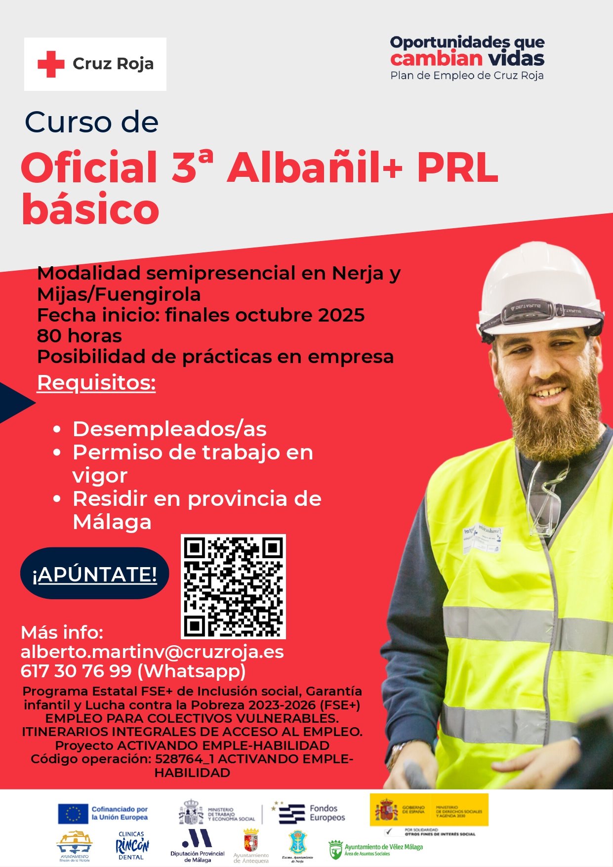 La Delegación de Empleo del Ayuntamiento de Marbella informa que CRUZ ROJA va a llevar a cabo la capacitación de OFICIAL 3ª ALBAÑIL + PRL BÁSICO, que tiene previsto impartir desde el Programa Itinerarios Integrales de Acceso al Empleo Activando Emple-Habilidad, dentro de la operación 528764_1 ACTIVANDO EMPLE HABILIDAD con la financiación del Fondo Social Europeo Plus (FSE+) con cargo al Programa Estatal de Inclusión Social, Garantía Infantil y Lucha Contra La Pobreza (CCI: 2021ES05SFPR003).