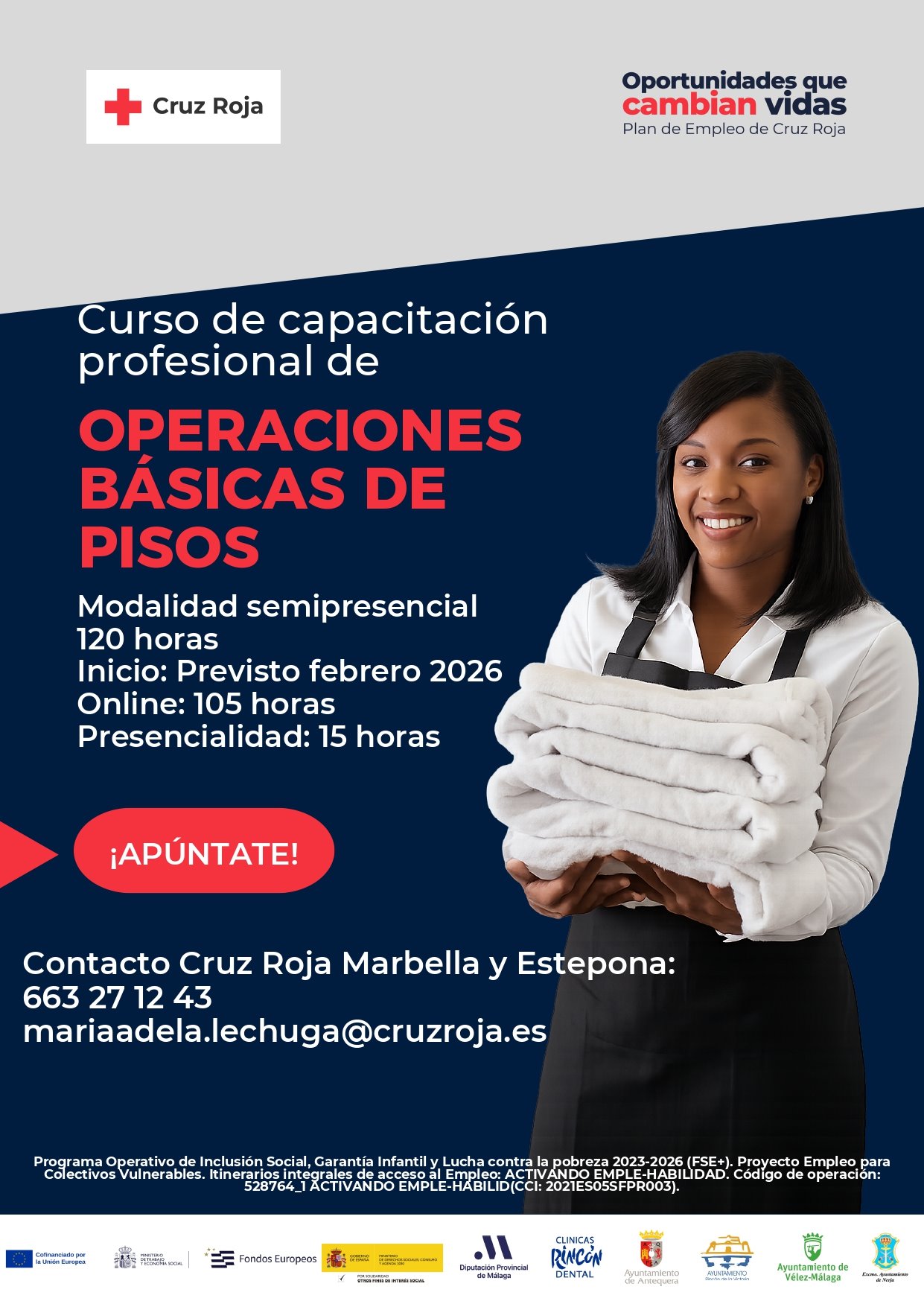 Desde la Delegación de Empleo del Ayuntamiento de Marbella informamos de la capacitación de OPERACIONES BÁSICAS DE PISOS, que tienen prevista impartir desde el Programa Itinerarios Integrales de Acceso al Empleo Activando Emple-Habilidad, dentro de la operación 528764_1 ACTIVANDO EMPLE HABILIDAD con la financiación del Fondo Social Europeo Plus (FSE+) con cargo al Programa Estatal de Inclusión Social, Garantía Infantil y Lucha Contra La Pobreza (CCI: 2021ES05SFPR003).